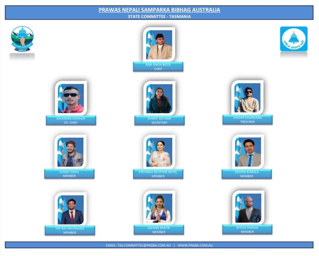 तास्मानिया क्षेत्रीय समितिको राज्य प्रमुखमा रवि सिंह बिष्ट, उप–राज्य प्रमुख कैलेंद्र दसौदि, सचिवमा रुमी गोतामे र शिशिर ढुंगानाले कोषाध्यक्षको जिम्मेवारी पाएका छन् । त्यस्तै सदस्यहरुमा सुजन थापा, सपना खत्री, प्रियंका न्यौपाने नेपाल, नितेश ढकाल, दीपक कोईराला र तप राज ढुंगाना रहेका छन् ।