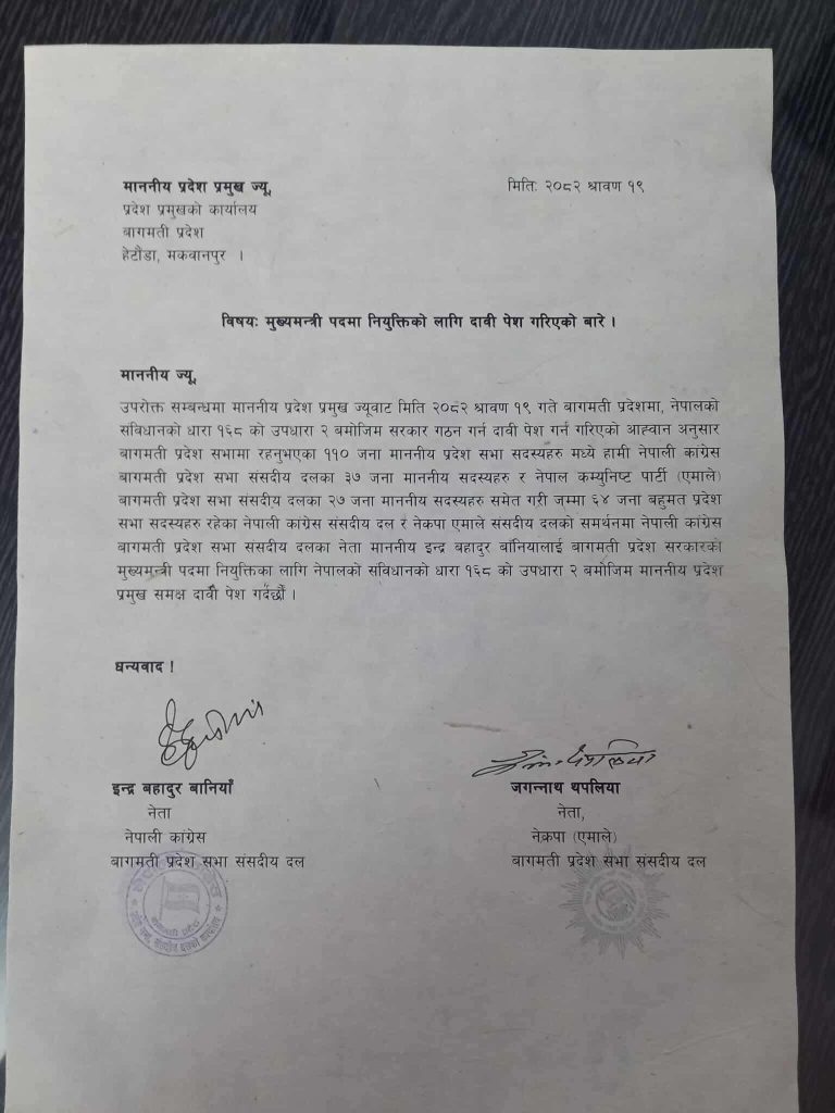 दाबी पत्रमा कांग्रेस संसदीय दलका नेता इन्द्रबहादुर बानियाँ र एमाले संसदीय दलका नेता जगन्नाथ थापलिया संयुक्त हस्ताक्षर गरेका छन् । यसअघि मुख्यमन्त्री बहादुर सिंह लामाले राजीनामा दिएपछि प्रदेश प्रमुखले नयाँ मुख्यमन्त्री नियुक्तिका लागि आह्वान गरेका थिए । प्रदेश प्रमुख कार्यालयले मङ्गलबार दिउँसो २ बजेसम्म सरकार गठनका लागि दाबी पेस गर्न आह्वान गरिएको छ ।