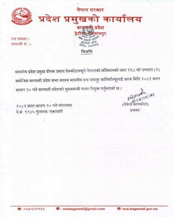 मकवानपुर । नेपाली कांग्रेस बागमती प्रदेश संसदीय दलका नेता इन्द्र बहादुर बाँनिया बागमती प्रदेशको मुख्यमन्त्री नियुक्त भएका छन् । प्रदेश प्रमुख दीपक प्रसाद देवकोटाले संविधानको धारा १६८ को उपधारा २ बमोजिम मङ्गलबार बाँनियालाई मुख्यमन्त्रीमा नियुक्त गरेका हुन् । बाँनियाले सोमबार नेपाली कांग्रेस र नेकपा एमालेका ६४ सांसदको समर्थनसहित मुख्यमन्त्री बन्नका लागि दाबी प्रदेश प्रमुख समक्ष पेश गरेका थिए । मुख्यमन्त्री बाँनियाको सपथ आजै साँझ हुने प्रदेश प्रमुखको कार्यालयले जनाएको छ ।