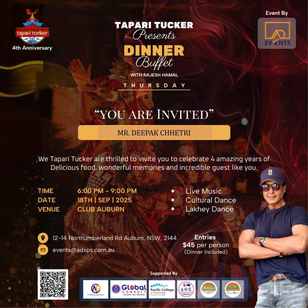 सिड्नीको क्लब ओबर्नमा आयोजना हुने सो कार्यक्रममा प्रस्तुतकर्ता टपरी टकर रहनेछ। रेष्टुरेन्टले सेवा प्रारम्भ गरेको चौथो वार्षिकोत्सवको अवसरमा आयोजना गर्न लागिएको कार्यक्रम भव्य र सभ्य गर्नका लागी विशेष तयारी रहेको विजय शाक्यले बताए।