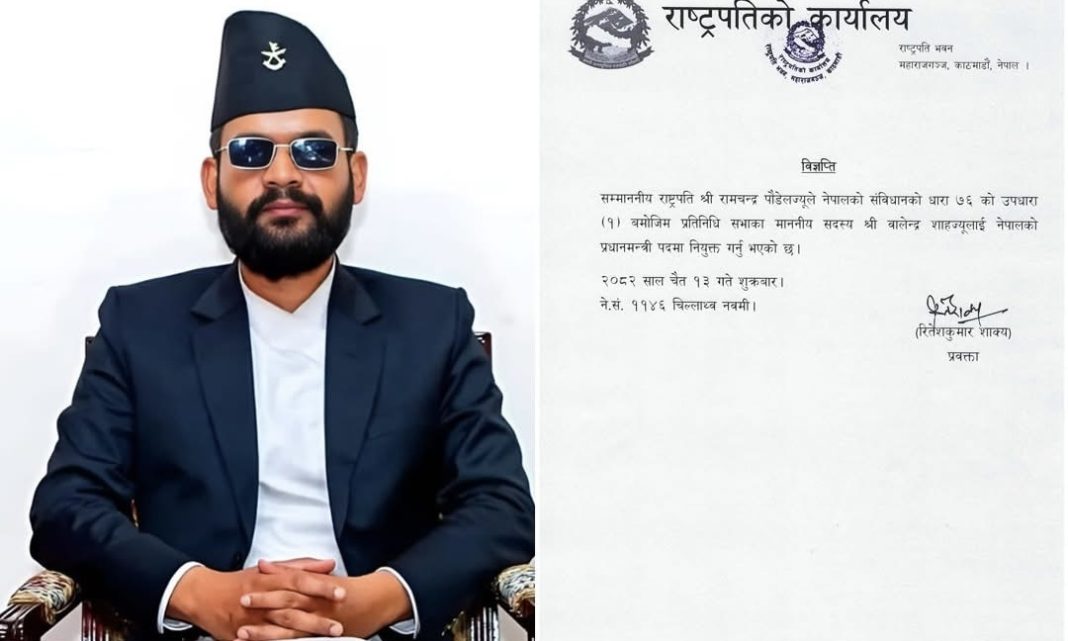 राष्ट्रपति भवन, महाराजगञ्जबाट जारी विज्ञप्तिमा भनिएको् छ, ‘सम्माननीय राष्ट्रपति श्री रामचन्द्र पौडेलज्यूले नेपालको संविधानको धारा ७६ को उपधारा (१) बमोजिम प्रतिनिधि सभाका माननीय सदस्य श्री वालेन्द्र शाहज्यूलाई नेपालको प्रधानमन्त्री पदमा नियुक्त गर्नु भएको छ ।’