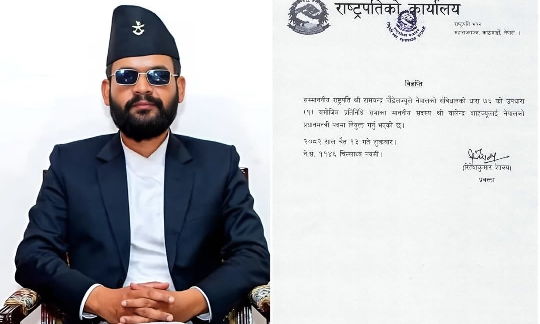 राष्ट्रपति रामचन्द्र पौडेलले राष्ट्रिय स्वतन्त्र पार्टीका वरिष्ठ नेता एवं प्रतिनिधि सभाका सदस्य बालेन्द्र शाह (बालेन)लाई प्रधानमन्त्री पदमा नियुक्त गरेका छन् ।