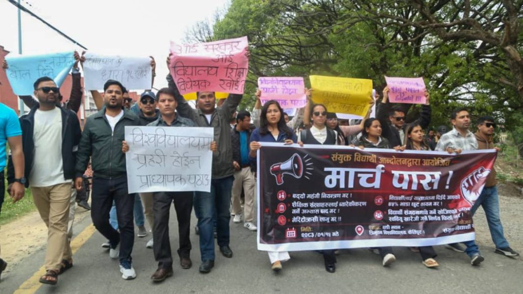 उनीहरुले शैक्षिक संस्थाहरुमा हुने छात्रा हिंसा बिरुद्ध एकजुट बनौँ, क्याम्पसहरु सुन पसल होइनन, विश्व विद्यालयमा प्रहरी होइन प्राध्यापक पठाउँ, ओइ सरकार ओई विद्यालय शिक्षा विद्येयक खोई लेखिएका पम्पलेट सहित प्रदर्शन गरेका हुन् ।